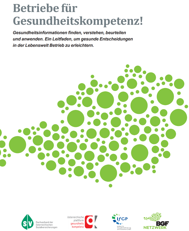 Dieser Leitfaden soll Betriebe im Rahmen der Betrieblichen Gesundheitsförderung auf dem Weg hin zu einer gesundheitskompetenten Organisation unterstützen. Als Zielgruppe des Leitfadens sind BGF-Projektleiter*innen und BeraterInnen zu sehen. Diese Personengruppe soll für das Thema Gesundheitskompetenz sensibilisiert, bei der Umsetzung im Betrieb unterstützt und der Nutzen für Betriebe soll aufgezeigt werden.